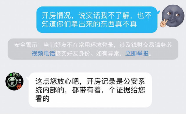 在讨价还价的过程中,这名信息贩子表示,查不了银行资产,但可以查开房记录,收费标准是近半年580元,查询时间每加一年加价100元,先付定金。记者佯装质疑,此人表示信息来源是公安系统,如记者有疑虑,也可以不交定金,看到证明截图后再交全款。