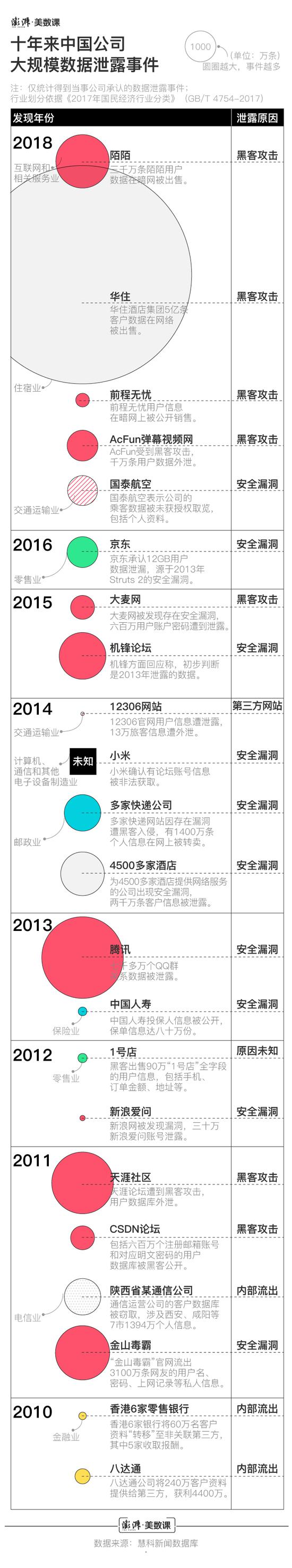 大数据时代,数据不仅是企业的核心财产,也事关用户最关心的隐私安全。然而,数据泄露事件却屡屡发生。澎湃新闻梳理了近十年来有关企业数据泄露的报道后发现,企业数据泄露事件不仅发生频率未减,被泄露的数据规模还在不断扩大。