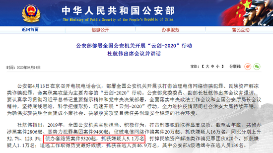 公安部网站14日信息显示,公安部4月13日在京召开电视电话会议,部署全国公安机关开展以打击治理电信网络诈骗犯罪、民族资产解冻类诈骗犯罪、命案积案攻坚为主要内容的“云剑-2020”行动。