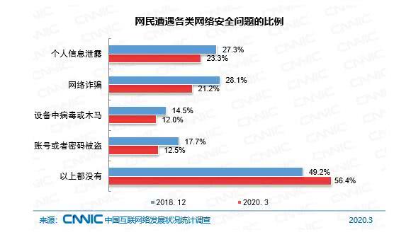《报告》显示,截至2020年3月,56.4%的网民表示过去半年在上网过程中未遭遇过网络安全问题,较2018年底提升7.2个百分点。通过分析网民遭遇的网络安全问题发现:遭遇网络诈骗的网民比例较2018年底下降明显,达6.9个百分点;遭遇账号或密码被盗的网民比例较2018年底下降5.2个百分点;遭遇其他网络安全问题的网民比例较2018年底也有所降低。