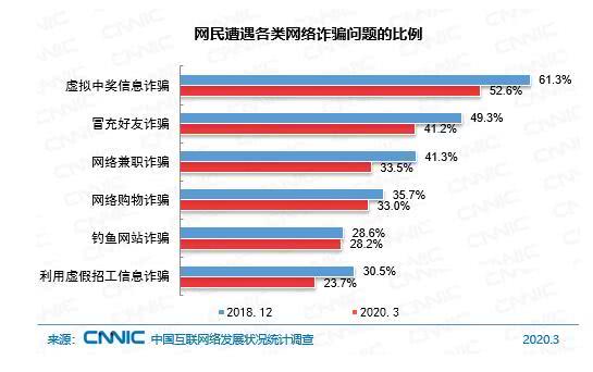 通过对遭遇网络诈骗网民的进一步调查发现:虚拟中奖信息诈骗仍是网民最常遭遇的网络诈骗类型,占比为52.6%,较2018年底下降8.7个百分点;冒充好友诈骗的占比为41.2%,较2018年底下降8.1个百分点;网络兼职诈骗的占比为33.5%,较2018年底下降7.8个百分点。
