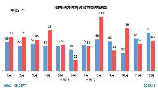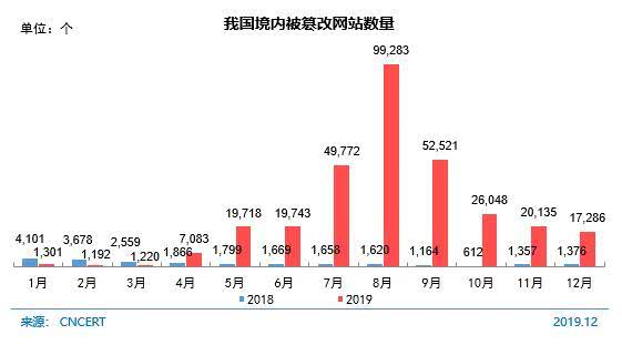 截至2019年12月,国家计算机网络应急技术处理协调中心(中文简称国家互联网应急中心,英文简称CNCERT)监测发现我国境内被篡改网站185573个 ,较2018年底(7049个)增长较大 。