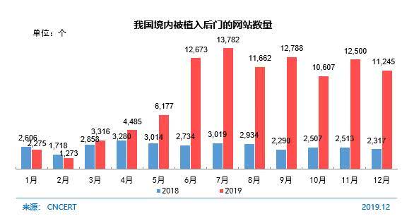 截至2019年12月,CNCERT共监测发现我国境内被植入后门的网站数量达到84850个,较2018年底(23608个)增长259.4%。