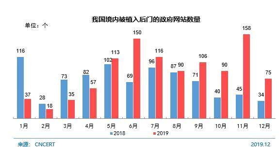 截至2019年12月,CNCERT共监测发现我国境内被植入后门的政府网站数量达到717个,较2018年底(674个)增长6.4%。