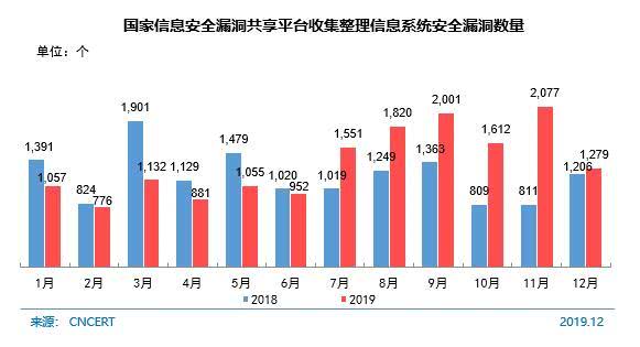 截至2019年12月,国家信息安全漏洞共享平台 收集整理信息系统安全漏洞16193个,较2018年(14201个)增长14.0%。