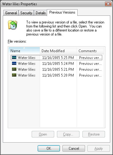在Vista中,用户激活了“System Protection”(默认激活)之后,系统将生成文件和文件夹的拷贝“影像”(也就是备份)。而在Vista之中,这个功能称为“Previous Versions”,并且可以通过右键的属性菜单“恢复以前版本”访问。