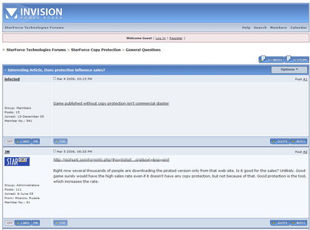 游戏制作公司Stardock一直拒绝采用类似StarForce这种比较偏激的防拷软件来保护自己的热卖作品《银河文明2》,他们觉得比较温和的序列号注册方式反而能提升自己的销量;但StarForce显然不认同这种观点,为此还专门在自己的网站里发帖说明盗版这头大灰狼是多么地危险: