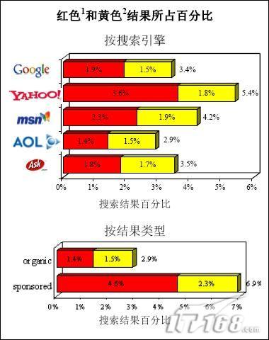 AOL返回的结果最安全:根据 McAfee SiteAdvisor 的评定,红色1或黄色2等级的站点占搜索结果的2.9 %。Yahoo! 返回的搜索结果中红色或黄色等级站点所占比例最高,为 5.4%。