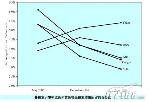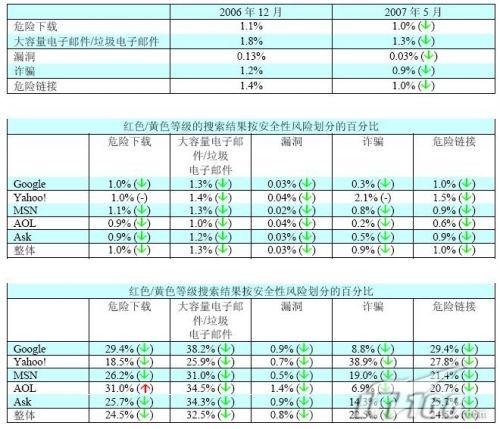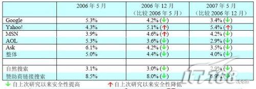 自2006年5月以来,Google、AOL和Ask返回的搜索结果的安全性不断提升,而Yahoo! 和 MSN 返回的搜索结果安全性却在下降。AOL 返回的结果是最安全的,仅 2.9% 的结果被 McAfee SiteAdvisor 评定为红色或黄色等级。