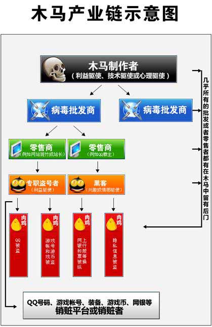 自2006年起,偷、骗、抢就已成为信息网络安全的三大威胁。而盗号木马、黑客后门病毒已经成为大多数职业病毒作者生财工具。木马/病毒背后的巨大的灰色产业链给整个互联网带来了更加严峻的考验。不管是网银中真实的钱,还是虚拟财产,制造木马、传播木马、盗窃账户信息、第三方平台销赃、洗钱,分工明确,形成了一个非常完善的流水性作业的程序。