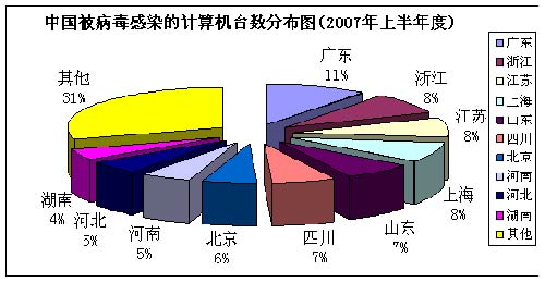 其中被病毒感染的计算机最多的地区主要分布为广州(11%)、浙江(8%)、江苏(8%)、上海(8%)、山东(7%)、四川(7%)、北京(6%)。