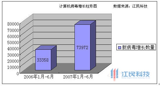 据江民科技反病毒中心统计,从2007年1月1日到2007年6月30日,反病毒中心共截获新病毒73972种,较去年同期增长了221%。江民KV病毒预警中心显示,1至6月全国共有14081895台计算机感染了病毒。