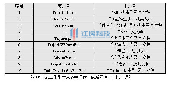根据江民全球病毒监测网(国内部分)、江民病毒预警中心、客户服务中心等多个部门联合监测统计,综合病毒的破坏能力以及传播范围,江民反病毒中心公布了2007上半年度十大病毒排行: