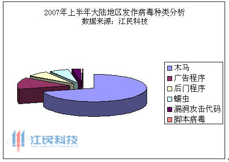 2007年上半年,江民反病毒中心共截获新病毒73972种,另据江民病毒预警中心监测的数据显示,1至6月全国共有14081895台计算机感染了病毒,其中感染木马病毒电脑9489649台,占病毒感染电脑总数的 67.38%,感染广告程序电脑1859165台,占病毒感染电脑总数的 13.20%,感染后门程序电脑928294台,占病毒感染电脑总数的6.59%,蠕虫病毒782380台,占病毒感染电脑总数的5.55%,监测发现漏洞攻击代码感染359772台,占病毒感染电脑总数的2.55%,脚本病毒感42346台,占病毒感染电脑总数的0.30%。