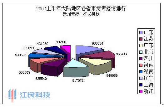 据江民病毒预警中心提供的数据显示,2007年病毒疫情比较严重的地区排前十位的分别是:山东、江苏、广东、北京、四川、河南、湖南、辽宁、上海和浙江。