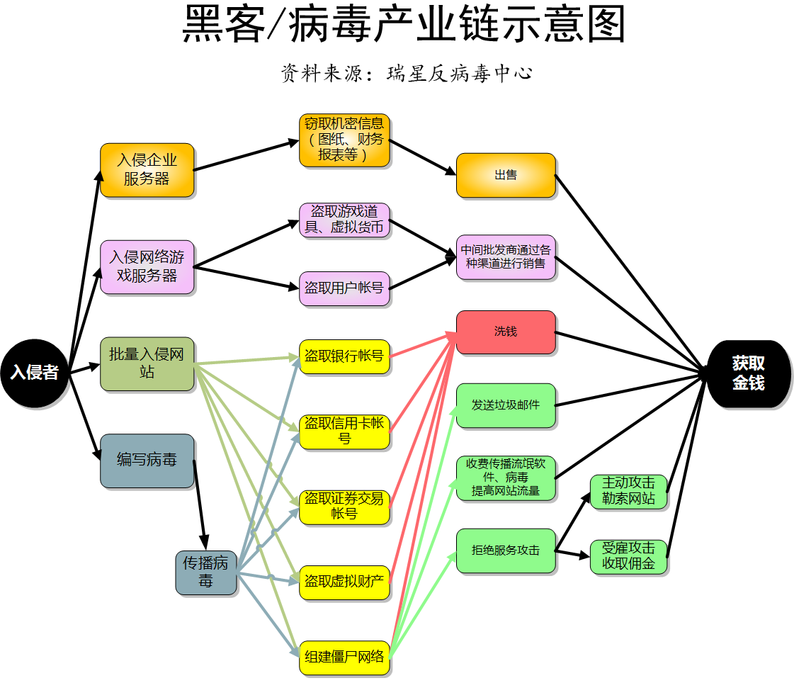 典型流程(1):黑客侵入个人/企业电脑——窃取机密资料———在互联网上出售——获取金钱。