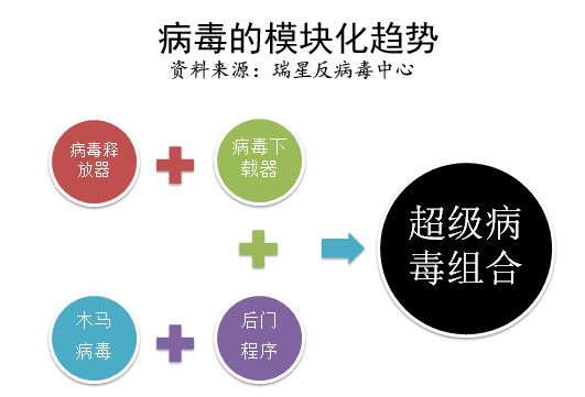 从制造病毒技术上说,黑客和病毒制造者大量采用“模块化编写”方法来批量制造新病毒。所谓“模块化编写”,就是黑客把传统上功能齐全的病毒,拆分为不同的功能模块,每个模块都成为单独的病毒。