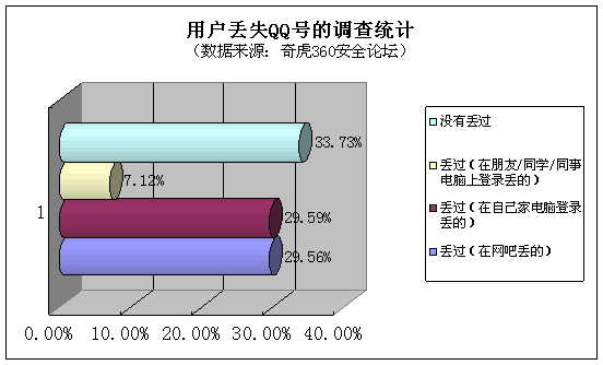 根据360安全论坛(bbs.360safe.com)中由5366名网友参与的调查统计表明,有66.27%的用户丢失过QQ帐号。