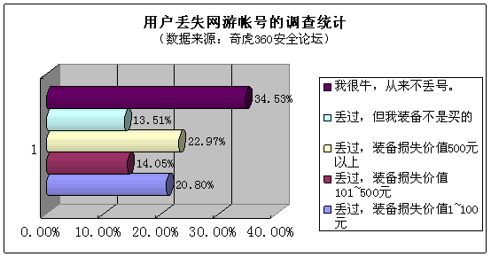 根据360安全论坛(bbs.360safe.com)中由370名网友参与的调查统计表明,也有65.47%的用户丢失过网游帐号。因为丢失网游帐号导致用户跳楼或到游戏公司门口自焚等极端事件也屡见于报端,网游盗号已经成为影响网游应用健康发展的重要障碍。