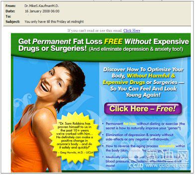 有一种垃圾邮件兜售一种神奇而时髦的、江湖庸医最喜欢用来骗人的药物,当然也没有忘记用遗传科学来对其进行包装。邮件称,“这一小小的珠宝能治愈肥胖症、抑郁症、关节炎、胆固醇过高、甚至阳痿!而且,它还能使你显得更年轻!不用药物,不用手术!”