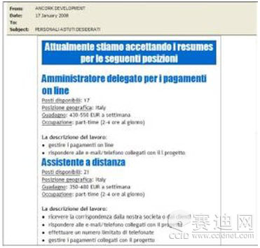 对上面的任何一个职位他们都说,你将只需要每天工作2-4小时,每周最多可以挣到 550欧元。这会是一个相当有诱惑力的就业机会,因为意大利当前的经济状况意味着人们很难找到工作,尤其是在大城市以外。该骗局的唯一要求是,申请人必须居住在意大利的某个地方。为什么是这样呢?当网络罪犯通过钓鱼攻击或其它欺骗手段获得银行信息时,他们经常需要进入欧洲、美洲等地的一个合法的银行账户,以便使交易不太可疑和不好追踪。填写简单电子邮件表格的任何人都有卷入“reciclaggio di denaro sporco”圈子的风险,“reciclaggio di denaro sporco”的意思是周转脏钱或洗钱。