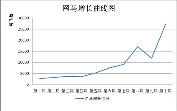 (上图为超级巡警连续九周的抽样调查统计图,其中:蓝线为网马的实际增长曲线、黑线为网马的增长趋势曲线)