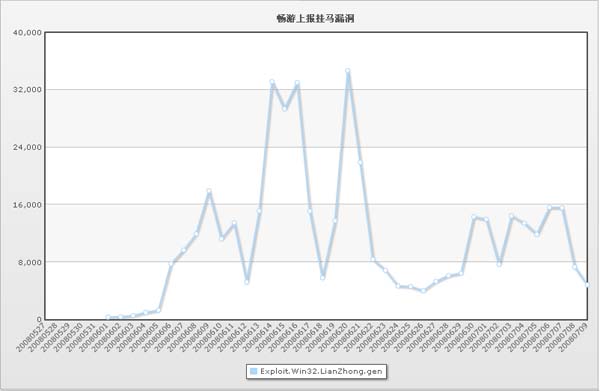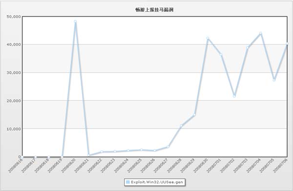 网络电视软件UUSee在刚出现短短几周的时间已经超过了MS06014。以此可见,网马的时效性也很强,尤其是一些0day网马,会在漏洞修补前被广泛利用。超级巡警团队在6月18日捕获利用UUSee 0day漏洞的网马,在通知了软件厂商后,立即发布了预警资讯。6月19日,该类网马的上报量在一天时间内竟达到近5万条,如下图: