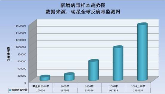 自从1988年莫里斯蠕虫病毒出现直到2004年,全球截获的电脑病毒总数有10万个;国内最大的安全公司瑞星最新公布的数据,目前每天截获的新病毒数量就高达8-10万个,仅2008年上半年瑞星全球反病毒监测网就发现了近156万个病毒,其中大部分是木马病毒。