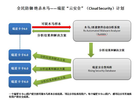 “瑞星卡卡6.0”的“自动在线诊断”模块,是“云安全”(Cloud Security)计划的核心之一,每当用户启动电脑,该模块都会自动检测并提取电脑中的可疑木马样本,并上传到瑞星“木马/恶意软件自动分析系统”(Rs Automated Malware Analyzer,简称RsAMA),整个过程只需要几秒钟。随后RsAMA将把分析结果反馈给用户,查杀木马病毒,并通过“瑞星安全资料库”(Rising Security Database,简称RsSD),分享给其他所有“瑞星卡卡6.0”用户。