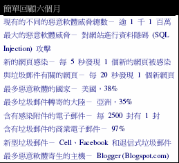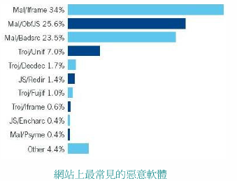 占据上表的恶意软件多数与资料隐码攻击有关。例如,Mal/Iframe的攻击无法用肉眼发现,它利用简单的HTML码放置针孔般大小的元素(仅1x1像素的大小),然后通过第三方网站执行恶意软件。与资料隐码攻击结合使用的话,将成为黑客的强效武器。