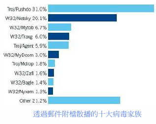 下表显示2008年1月至6月通过邮件附件散播的恶意软件家族排行榜。