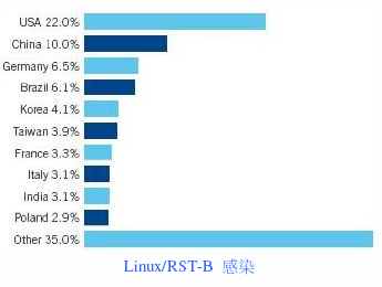 在发布免费的解毒工具并进行深入研究以后,Sophos Labs发现有上千台Linux计算机在root层级感染了Linux/RST-B,使黑客能够利用Linux计算机来控制僵尸电脑网络(botnet)。我们必须强调,其中只检查了root层级的感染情况;若检查被入侵的非root账号之数量,可能发现规模更大的入侵。