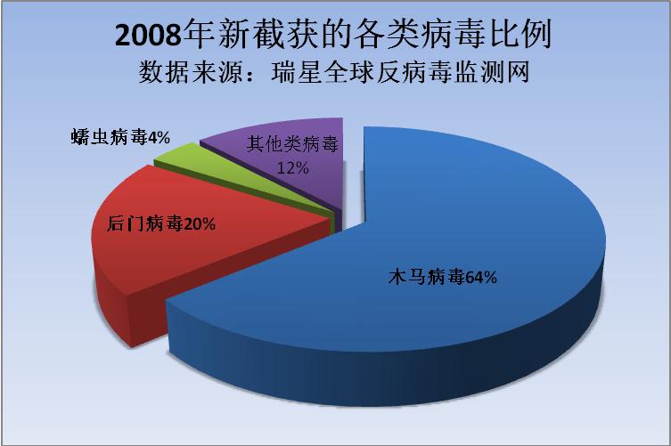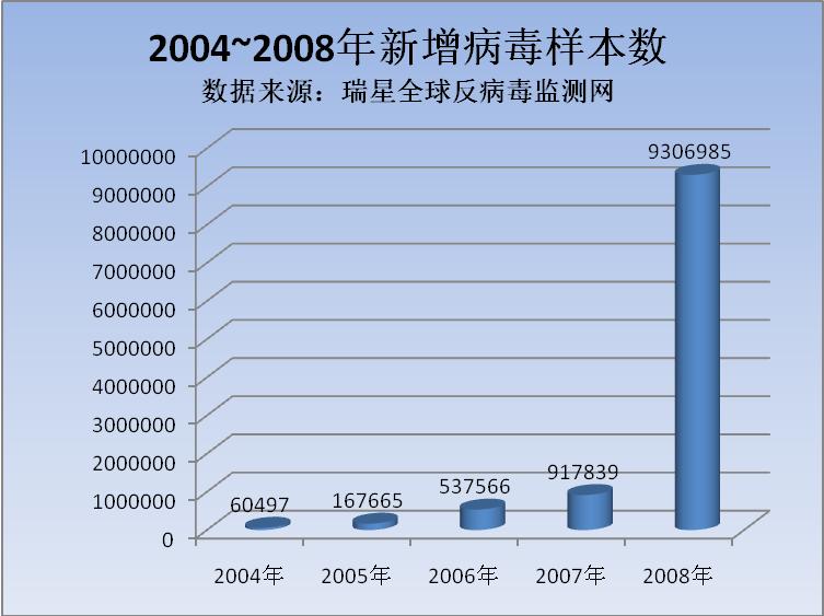 2008年1月至10月,瑞星公司共截获新病毒样本9306985个(注1),是去年同期的12.16倍。其中木马病毒5903695个,后门病毒1863722个,两者之和超过776万,占总体病毒的83.4%。这些病毒都以窃取用户网银、网游账号等虚拟财产为主,带有明显的经济利益特征。
