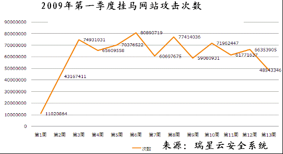 2009年1月1日至3月31日,瑞星“云安全”数据中心已拦截到800412435人次访问挂马网站,每天平均访问人次达8893471次。也就是说,平均每天有889万余人次网民访问过恶意网页。