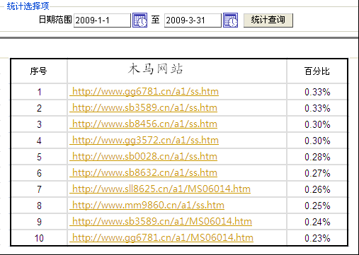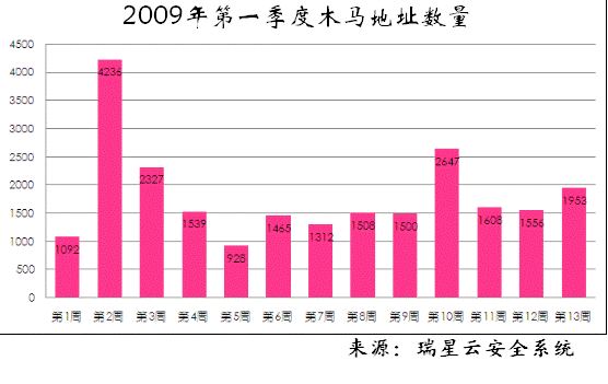 瑞星“云安全”数据中心的统计表明,2009年第一季度截获的挂马网站(网页数量)总数目为197676188个,平均每天截获2196402个;挂马网站攻击总次数800412435次,平均每天遭遇攻击次数达8893471;其中确定是大型网站被挂马的“挂马网站”总数为24202个,平均每天有268个大型网站被挂马,2009-1-7当天拦截的“挂马网站”高达1011个。