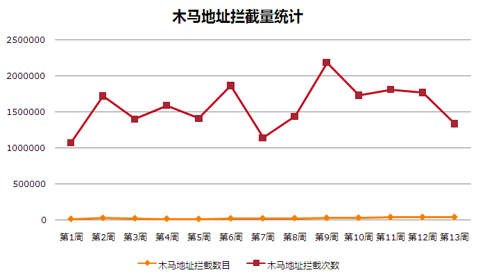 “木马地址”是指可以直接下载木马病毒的URL网址,从瑞星“云安全”数据中心第一季度统计看,被拦截的木马地址数目为398966个,去掉重复地址后的数目是10947个,拦截次数共20394247次。
