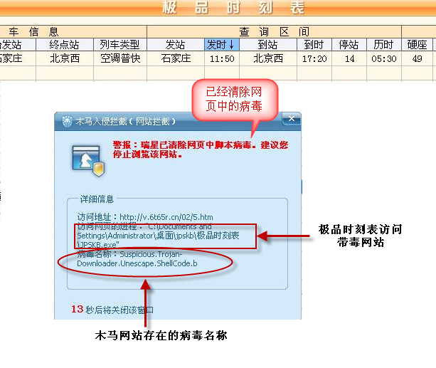 再以“极品时刻表”被挂马为例,被植入木马的网页为极品时刻表内嵌的广告网页,用户点击“查询”按钮之后,该软件会自动打开那个被挂马的网页。安装了“瑞星杀毒软件2009”或“瑞星全功能安全软件”会立即提示网页存在恶意代码,并显示病毒名称,如下图。因为其独有的“木马入侵拦截”功能可以拦截挂马网站带有的木马。