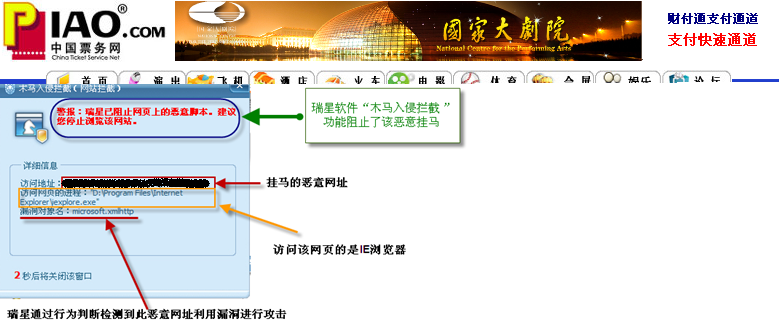 再以09年6月28日“中国票务网(htxxp://www.piao.com/)被植入恶意代码为例。用户访问该页面将被安装木马病毒等恶意程序,可以导致电脑被黑客控制并且被窃取敏感信息。 【MalUrl:htxxp://www.piao.com/c_lvyou /index.asp】,安装了“瑞星杀毒软件2009”或“瑞星全功能安全软件”会立即提示网页存在恶意代码,并进行拦截,如下图。