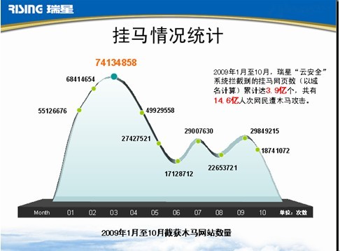 从数据来看,受网络挂马攻击的用户人数,从2009年3月份的7413万,下降到了 1874万。而从黑客发布的木马攻击地址来看,并没有太大起伏。这就是说,黑客攻击的强度未变,而侵袭成功的网民人数下降到原来的25%。这说明,瑞星 “云安全”系统在互联网安全领域的深入应用,取得了良好的效果。