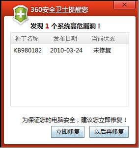 石晓虹表示,自今日凌晨4点起,360安全卫士已向受漏洞影响用户推送补丁。他介绍说,360安全卫士已经升级了新版的“漏洞修复”模块,能大幅提升漏洞的扫描和打补丁速度,用户通过全新的漏洞提示窗口就可以一键自动修复IE“内存破坏”漏洞。
