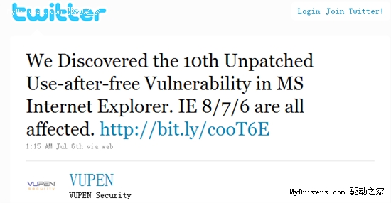 在官方微博上,VUPEN写道:“我们发现了IE中存在的第十个未补丁的Use-after-free漏洞,IE 8/7/6均受影响。”正如之前所说,只有付费用户才有权查看VUPEN的调查研究报告。