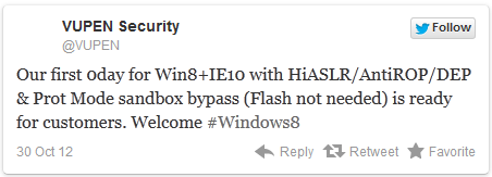 Windows 8推出后短短几天就被打破了?一家法国安全公司VUPEN声称,他们已经发现了这样的一个0day漏洞,现在正向其它的公司出售这些信息。VUPEN公司在Twitter上说道,他们已经找到了一种围绕Windows 8和IE10的安全特性,任何公司或政府愿意付出大量的金钱购买这些信息以保护他们的Windows 8系统。