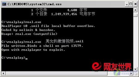 这个视频木马利用了RealPlayer的“.smil文件处理缓冲区溢出漏洞”,当别人播放时会造成溢出,我们就可以连接控制对方的主机。首先将溢出程序“real.exe”下载,在“运行”中输入CMD打开命令提示符窗口,进入溢出程序所在的文件夹。溢出程序的命令格式为:“real.exe< 生成文件名>”;