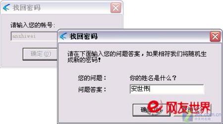 一些用户在注册时设置了密码找回功能,这类用户的密码往往设置得较为安全,不易猜测。不过如果你有细心与想象力,密码找回功能也可以破解出密码。以笔者为例,在用户列表中看到有一个名为“anshiwei”的用户,很明显示这串字符肯定是用户真实姓名的汉语拼音(如图5)。于是先尝试用“123456”登录,结果没有成功。再点击登录框中的“忘记密码”按钮,选择“回答问题找回密码”方式。点击下一步,输入要破解的用户名“anshiwei”,弹出问题回答对话框。问题是“你的姓名是什么?”(如图6),很明显可以利用该用户姓名的汉语拼音推出汉字来——不是“安世伟”,就是“安世威”、“安寺伟”之类的,反正总不可能是“俺是萎”吧?呵呵!回答问题只能三次,如果答案错误的话,可以返回登录窗口,再次使用“忘记密码”功能重新猜测。