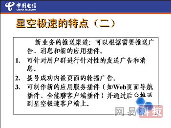 在电信内部资料里这样描述星空极速的功能,“星空极速客户端软件除了具有基本的拨号功能外,还可以进行其他业务的宣传营销。客户端软件运行在用户端,是电信运营商到目标客户群最直接的渠道,在用户达到一定规模的时候,通过客户端向用户发送广告消息、推送增值服务是最快捷、最有效也是成本最低的方式。”在这份内部资料里还介绍将采取“内嵌浏览器显示营销页面”“增值服务插件按钮”等桌面营销手段。