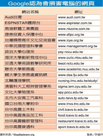 Google指出,这些网站可能含有“隐匿强迫下载”恶意程序,网友看文章、欣赏照片时,不知不觉被安装木马、后门程序、间谍软件或其它病毒软件,计算机无故当机只是小case,严重时会窃取计算机中个人资料,曾在网络银行输入的帐号密码,也可能被侧录。