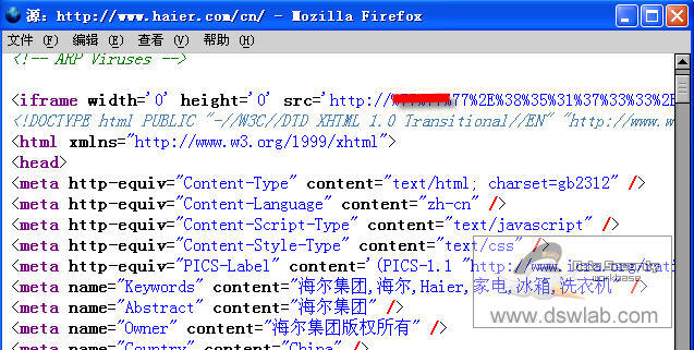 今日,DSW Lab Avert小组监测到国内知名网站海尔集团(http://www.haier.com)官方页面被挂木马,挂马方式采用常见的.JS脚本,当用户访问海尔集团的首页时会触发木马链接,其中一个挂马链接利用MS07-017ANI光标漏洞,关于光标漏洞见:http://dswlab.com/vir/v20070329.html,页面被插入如下代码,用以激活木马页面连接: