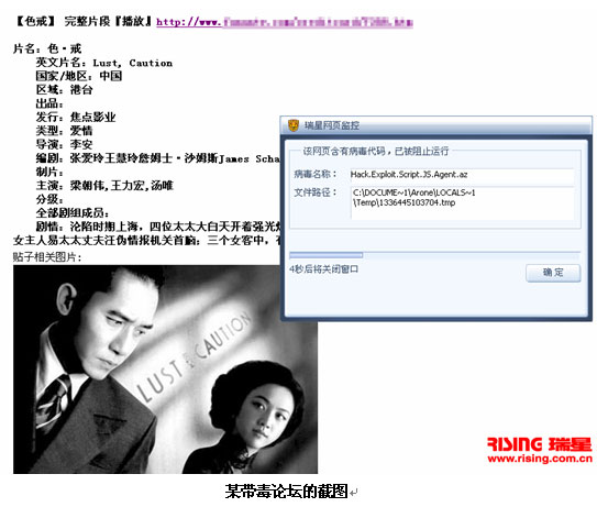 和讯IT从瑞星公司了解到,自本周开始,通过热门电影《色•戒》来传播病毒的案例大量出现,据不完全统计,带毒的“色戒”网站、论坛和博客至少有数百个,某些热门论坛的首页下载链接中,有15%左右带有病毒,缺乏防范措施的用户只要浏览这些网页、或者从带毒网站下载了《色戒》电影,就可能已经中毒,中毒用户可能被窃取网络游戏密码、QQ密码等。