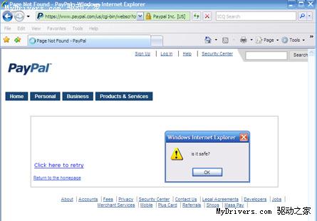 该跨站点脚本错误之所以问题严重,是因为它驻留在网页上,并使用扩展验证的Secure Sockets Layer(SSL)证书,此机制原本是为了向用户提供更高的安全性。但是事实上,此代码已经被芬兰研究人员Harry Sintonen攻破,他利用自己修改的代码制造出了警告窗口。如下图
