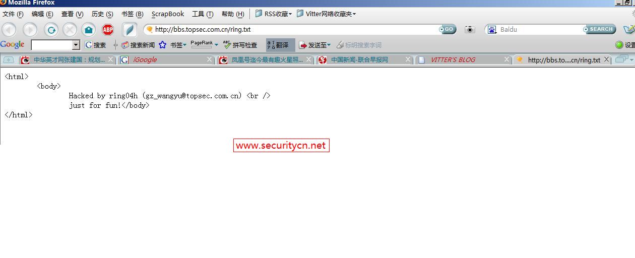 截至到发稿时间入侵文件还在。http://bbs.topsec.com.cn/ring.txt